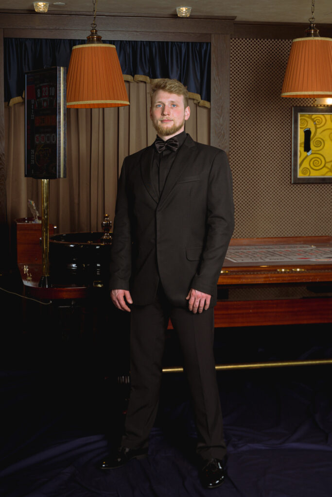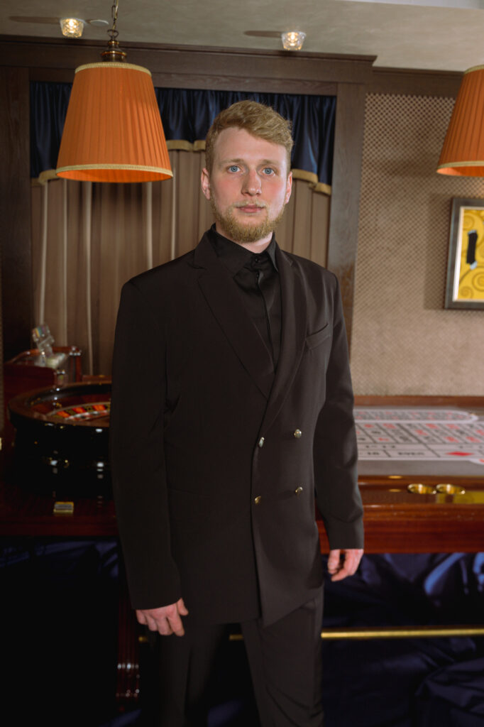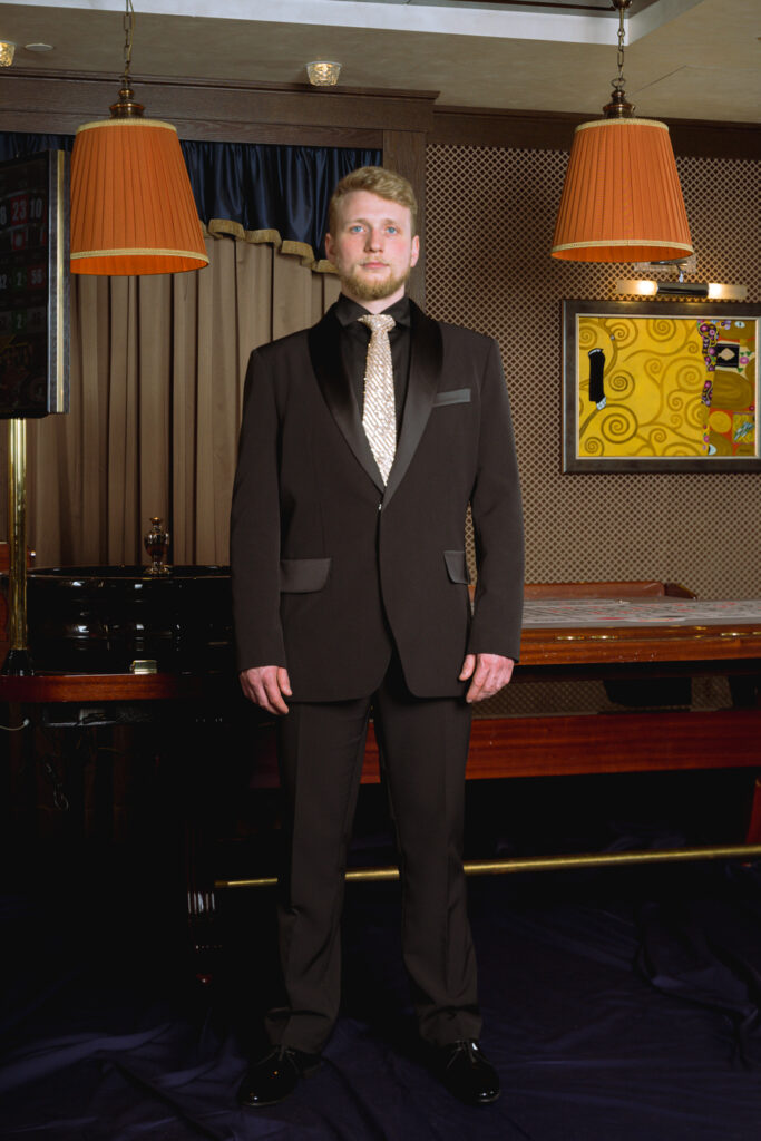 Blazer 18-1042 (men) Classic fitted single-breasted blazer with satin tuxedo lapels and flap pockets. Fabric: 65% Polyester 35% Viscose Lining: 100% Polyester Can be customized as per client request. Print Contact Us
