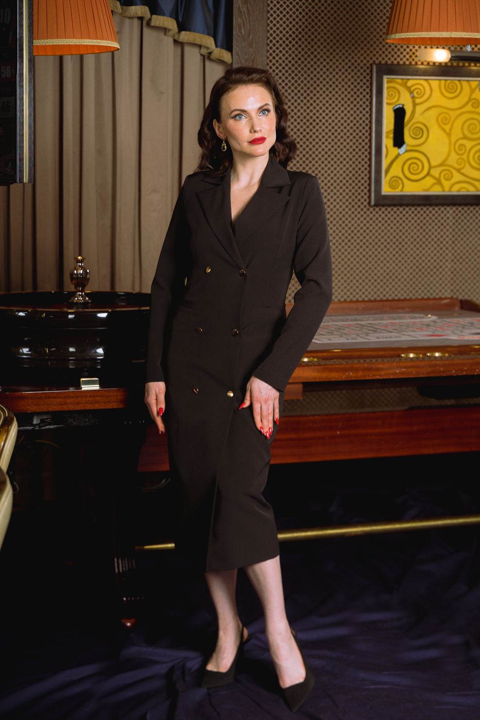 Midi double-breasted tuxedo dress with gold buttons.