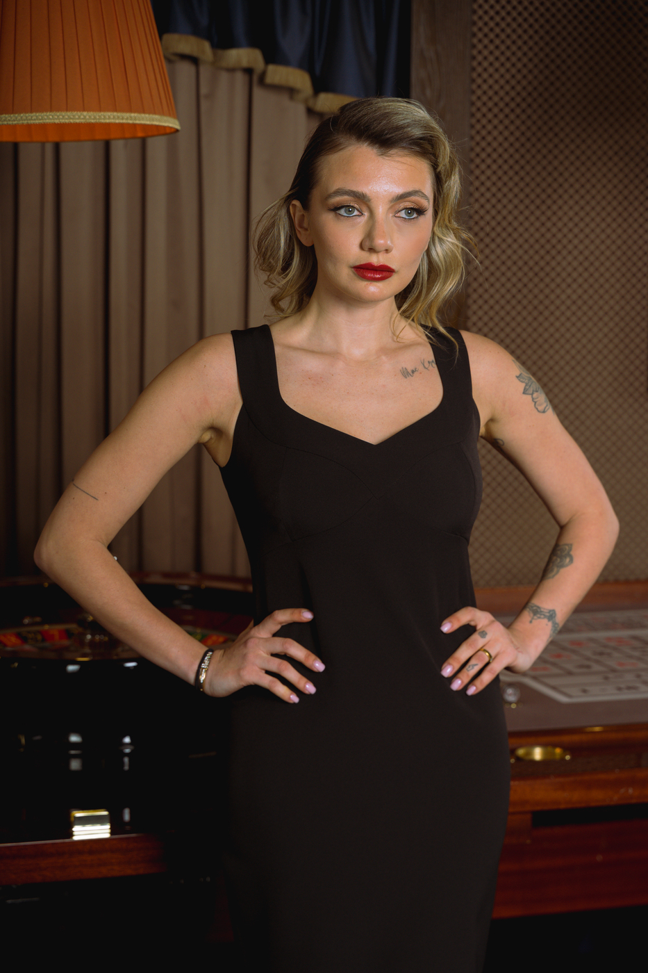 Dress 11-1061/1 (women) Fitted pencil bodycon dress with geometric necline and back slit. Fabric: 94% Polyester 6% Spandex Can be customized as per client request. Print Contact Us