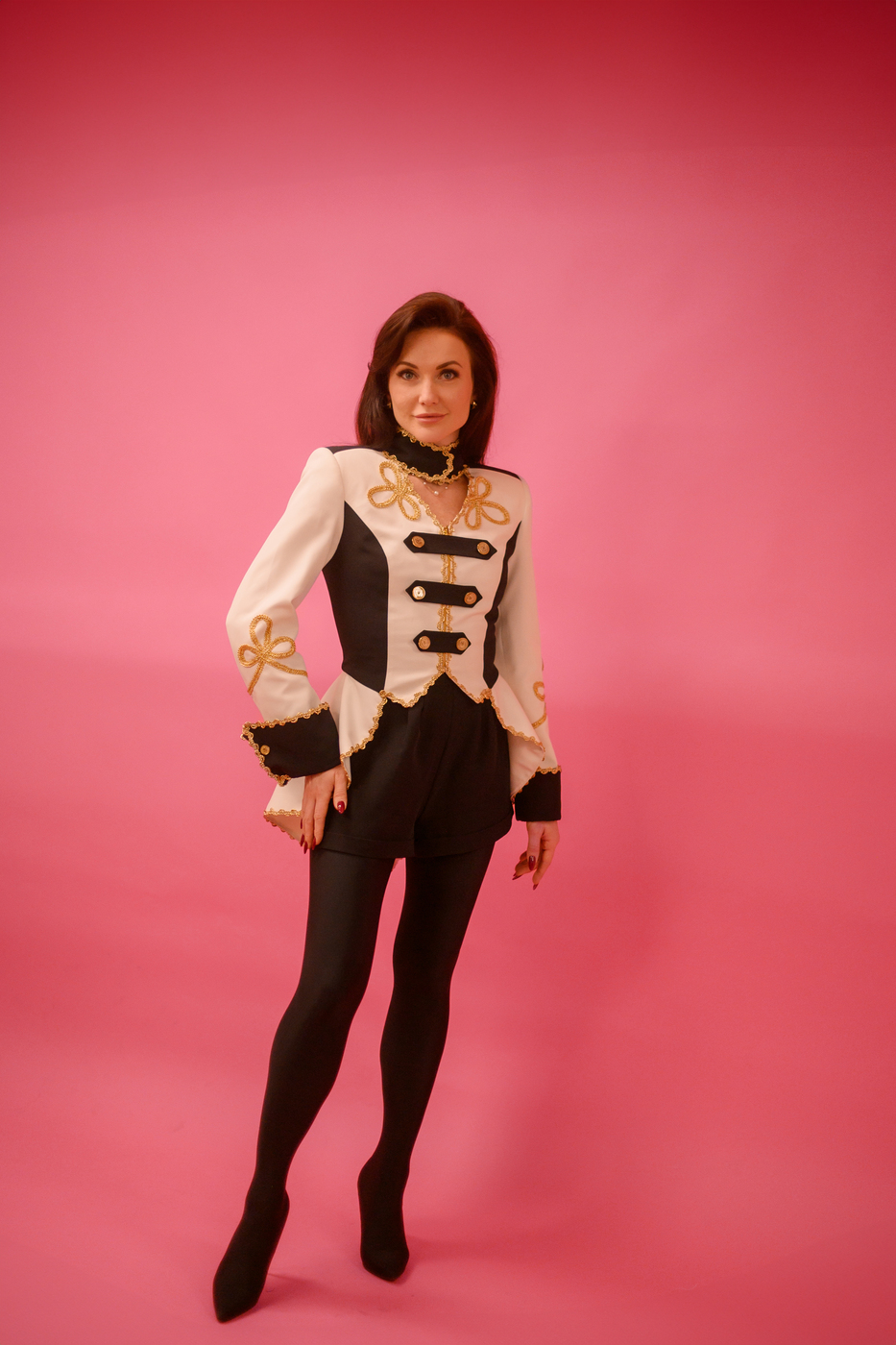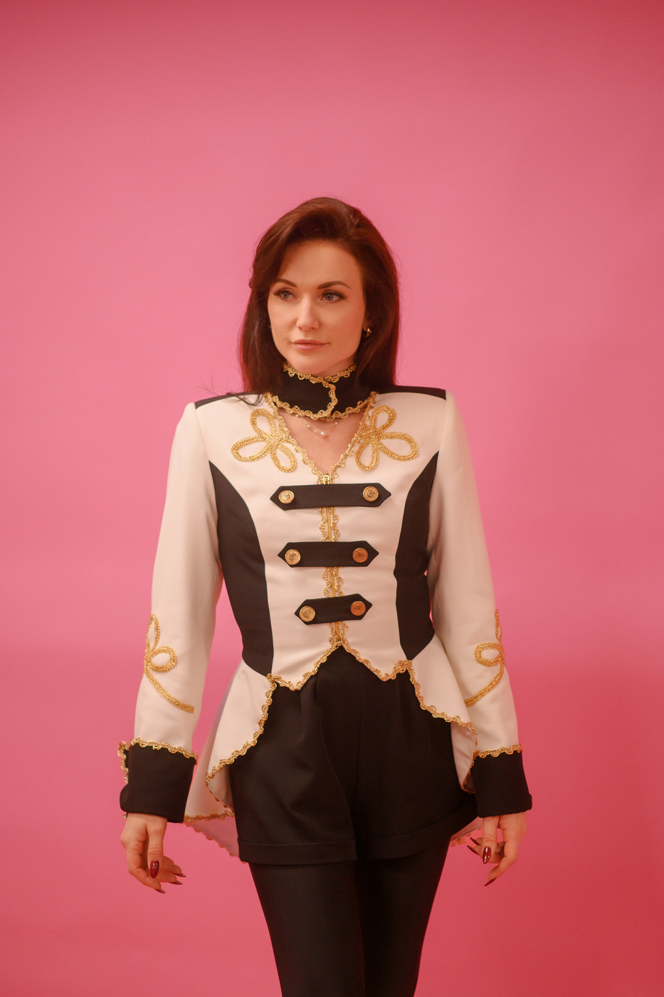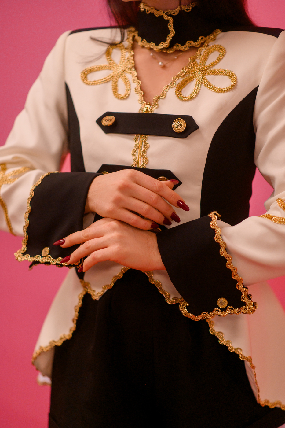 JACKET 17-1050 (women) Cropped velvet blazer with embriodery and sew-on rhinestones. Fabric: 100% Polyester Can be customized as per client request. Print Contact Us