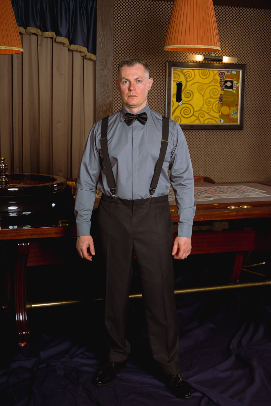 Trousers 15-1042 (men) Classic straight fit trousers with or without pockets. Fabric: 65% Polyester 35% Viscose Can be customized as per client request. Print Contact Us