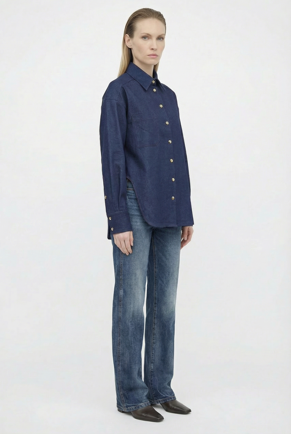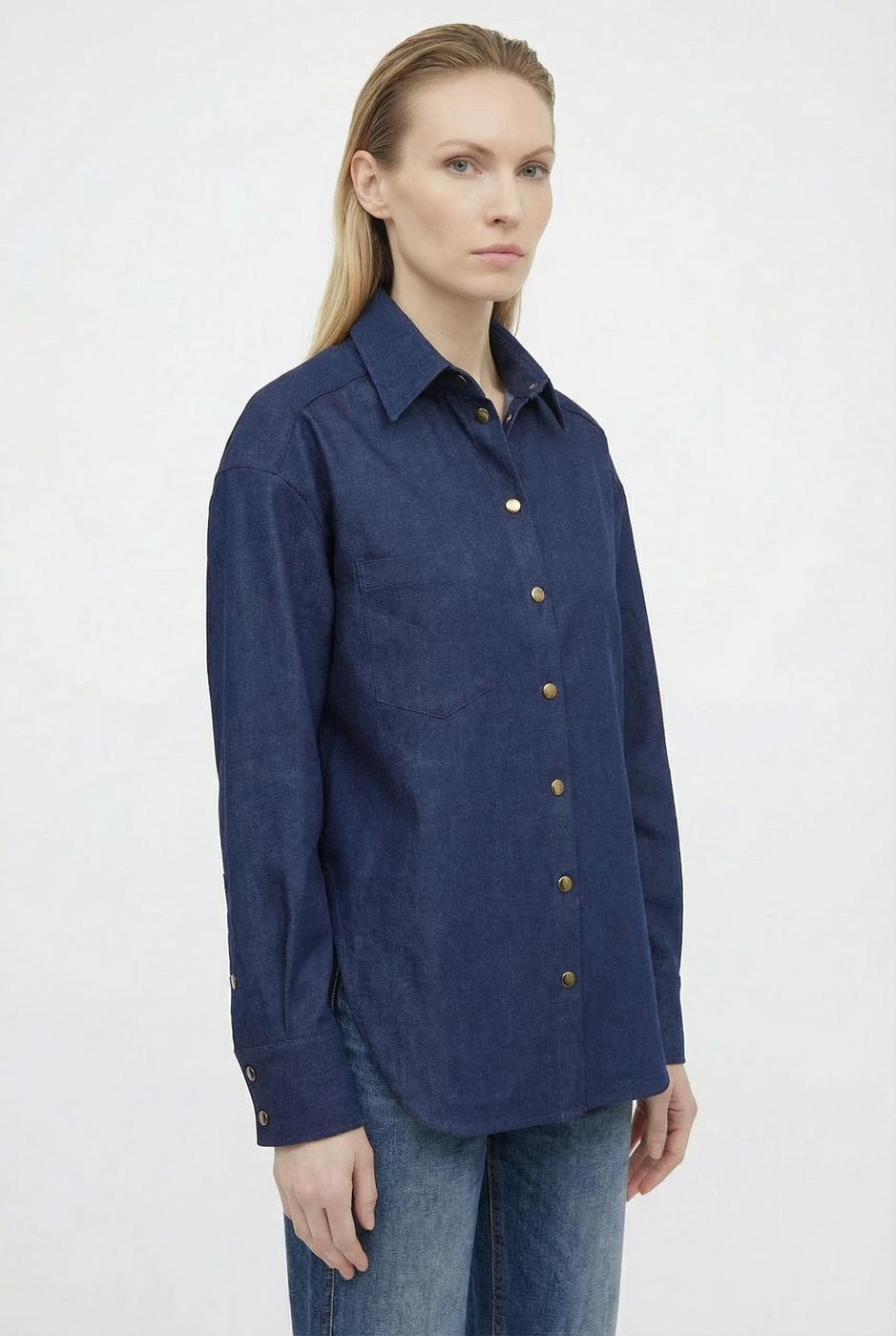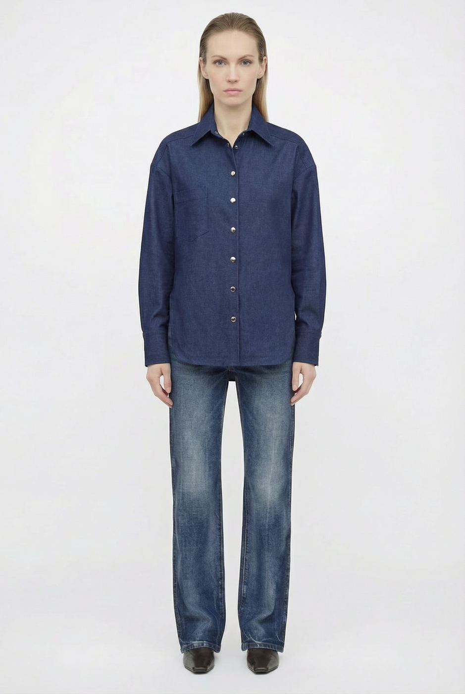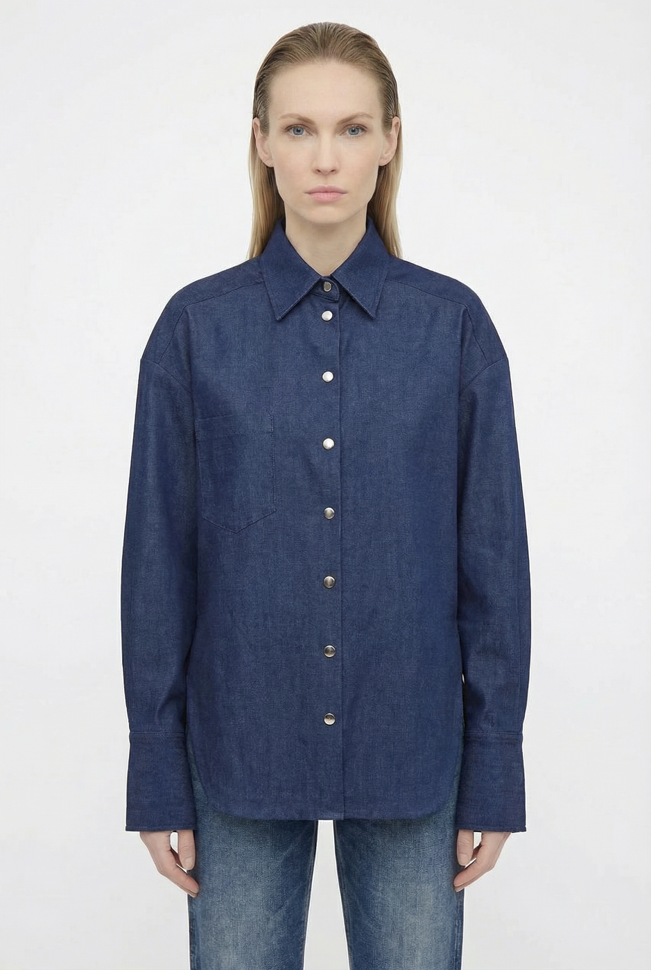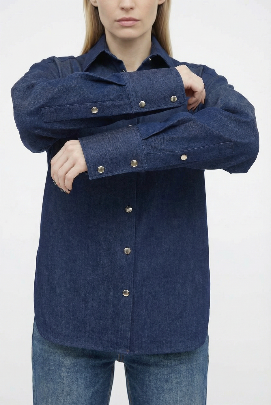 M0062 (woman) Same signature fit, new attitude. This version of our bestselling denim shirt comes in a premium dark wash for a sharper, more elevated look — perfect for styling up or down. Just like the original, it features snap buttons and a boxy, relaxed cut. Fabric color can be fully customized to suit your needs. Print and embroidery available on request. Ideal for upscale casual uniforms, creative merch, or timeless statement pieces. Print Contact Us